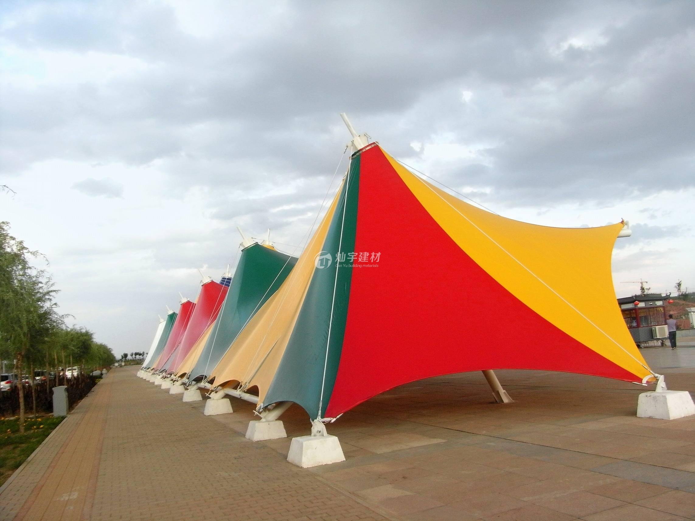 多色膜材色樣 迷彩色膜材照片 吳江東太湖彩色膜結(jié)構(gòu)景觀棚安裝完畢,燦宇多色的景觀棚為東太湖優(yōu)美的景色爭光添彩,燦宇多色系景觀棚為受到客戶游客上下一致認(rèn)同,燦宇彩色膜結(jié)構(gòu)車棚,還有其它顏色可選,紅黃藍(lán)綠青蘭紫迷彩色滿足不同客戶的個性審美需求,為單調(diào)的白色膜結(jié)構(gòu)車棚市場增加一點新意創(chuàng)意. 如有需要請致電熱線400-799-8099蘇州燦宇景觀棚