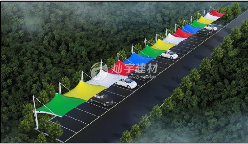 燦宇彩色膜結構車棚,還有其它顏色可選,紅黃藍綠青蘭紫迷彩色滿足不同客戶的個性審美需求,為單調的白色膜結構車棚市場增加一點新意創意.