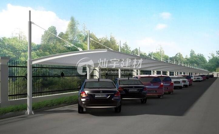 膜結(jié)構(gòu)停車棚所用膜材料由基布和涂層兩部分組成。膜結(jié)構(gòu)具有強(qiáng)度低、彈性大、易老化、徐變大、自潔性差,但價(jià)格便宜,容易加工制作,色彩豐富,抗折疊性能好等等特點(diǎn)。